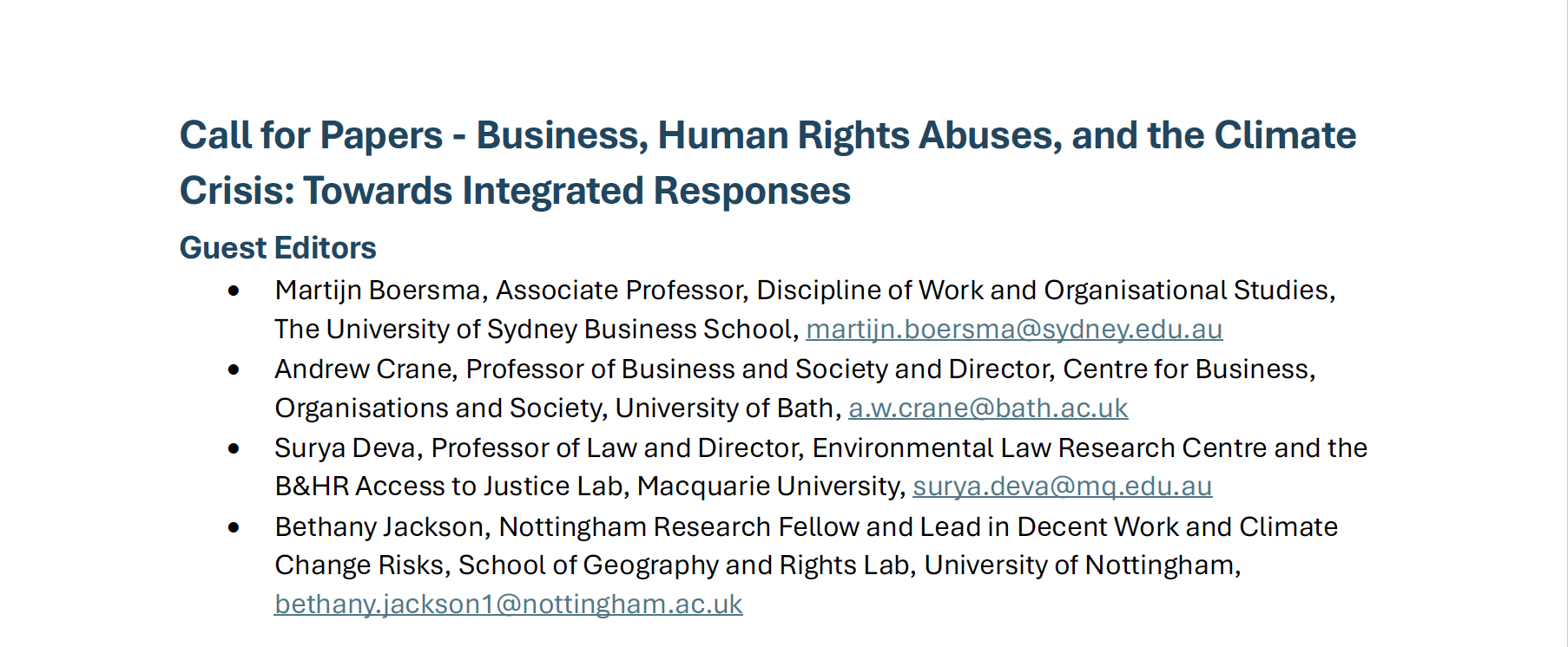 Conceptual and normative papers are encouraged, as are empirically grounded studies in which analysis is used to develop, challenge, or refine ethical concepts and arguments. The Special Issue is open to submissions from diverse disciplinary perspectives, including – but not limited to – corporate governance, operations and supply chain management; law, regulation and litigation; sustainability and climate justice; sustainable development; accounting, disclosure, and transparency; work and organisational studies; and political science and international relations, provided that submissions advance business ethics theory rather than merely applying external frameworks.